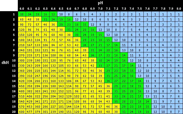 Un pic cam mare KH-ul si va trebui sa bagi mult CO2 ca sa scazi ph=ul dar iarasi nu este o problema sa duci pH-ul pe la 7. Vezi tabelul de mai jos - relatia pH, Kh si concentratia de CO2.