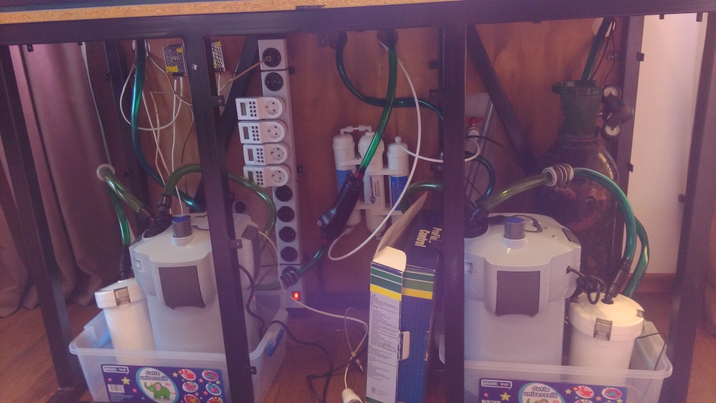 Filtrarea: doua canistre SunSun 404B cu debit teoretic de 2000l/h umplute fiecare cu cate 4 litri de Matrix si cate 3 litri de Siporax. Pe tragerea fiecarui filtru este montat cate un prefiltru de cate 2,8l cu bureti de diferite porozitati + un strat de perlon. La unul din canistre i-am scos alimentarea lampii UV in exterior pentru a o putea pune pe o priza programabila.