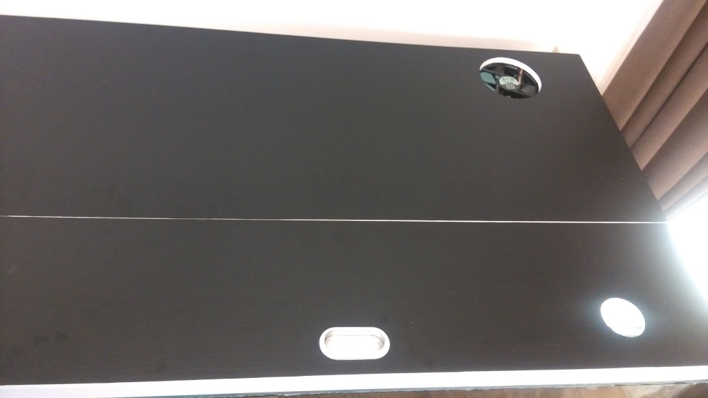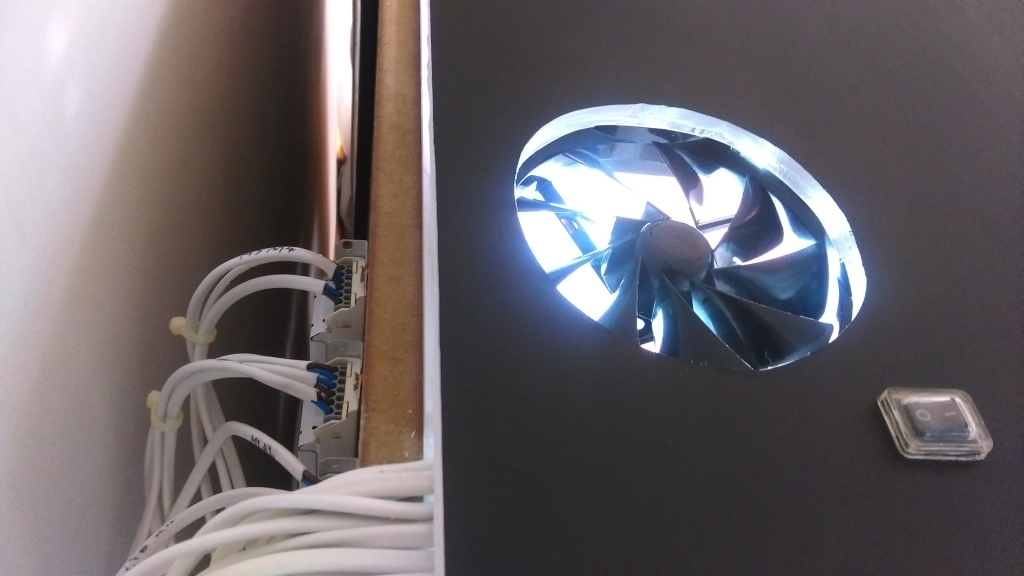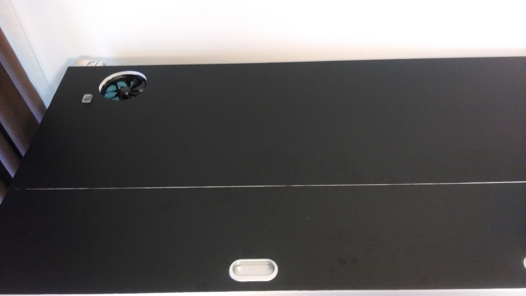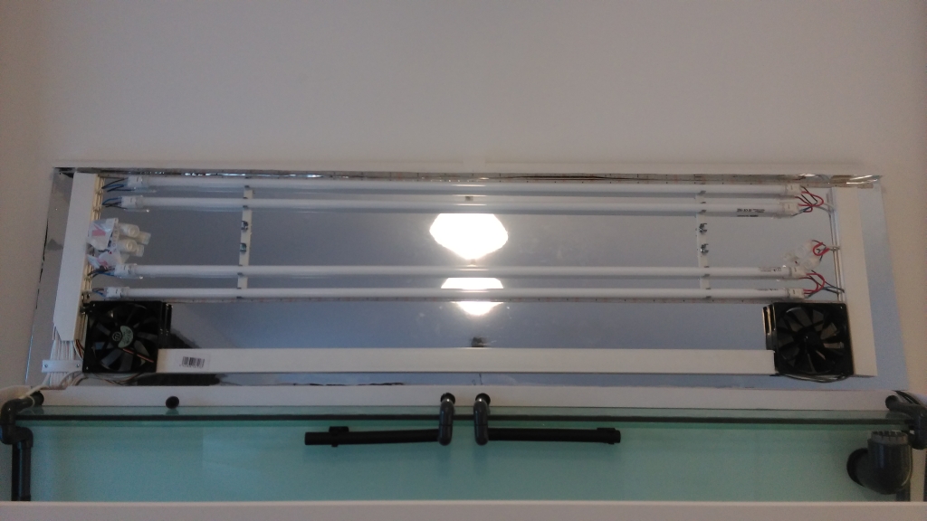 Capac si rama interioara superioara din comatex de 10mm construit personal si echipat cu doua ventilatoare, instalatie pentru 6 neoane T5 de 54W si doua benzi cu leduri albastre. Deocamdata am 2 x giesemann aquaflora si 2 x osram 865. Drosserele Osram sunt pozitionate inafara acvariului, mascate in spate. Autocolant oglinda. apacul este din doua bucati, una frontala, mai usoara pentru acces si hranire, cealalta pt iluminat si ventilatie, ce se rabateaza la nevoie la perete.
