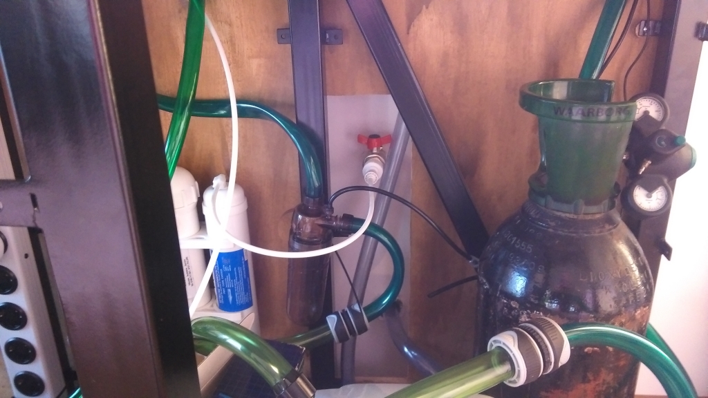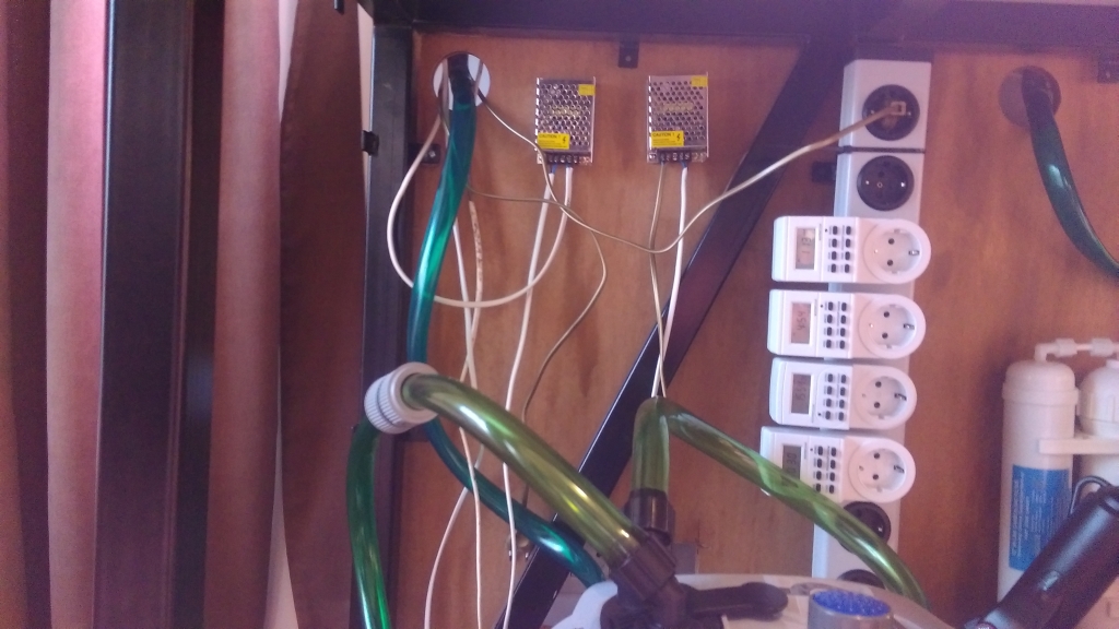 Instalatie de schimb la picatura, alimentarea trecand printr-un set de filtre si terminandu-se cu un picurator de 2l pe ora (testat). Overflow direct la canalizare. Alimentarea si canalizarea sunt mascate in spatele acvariului.