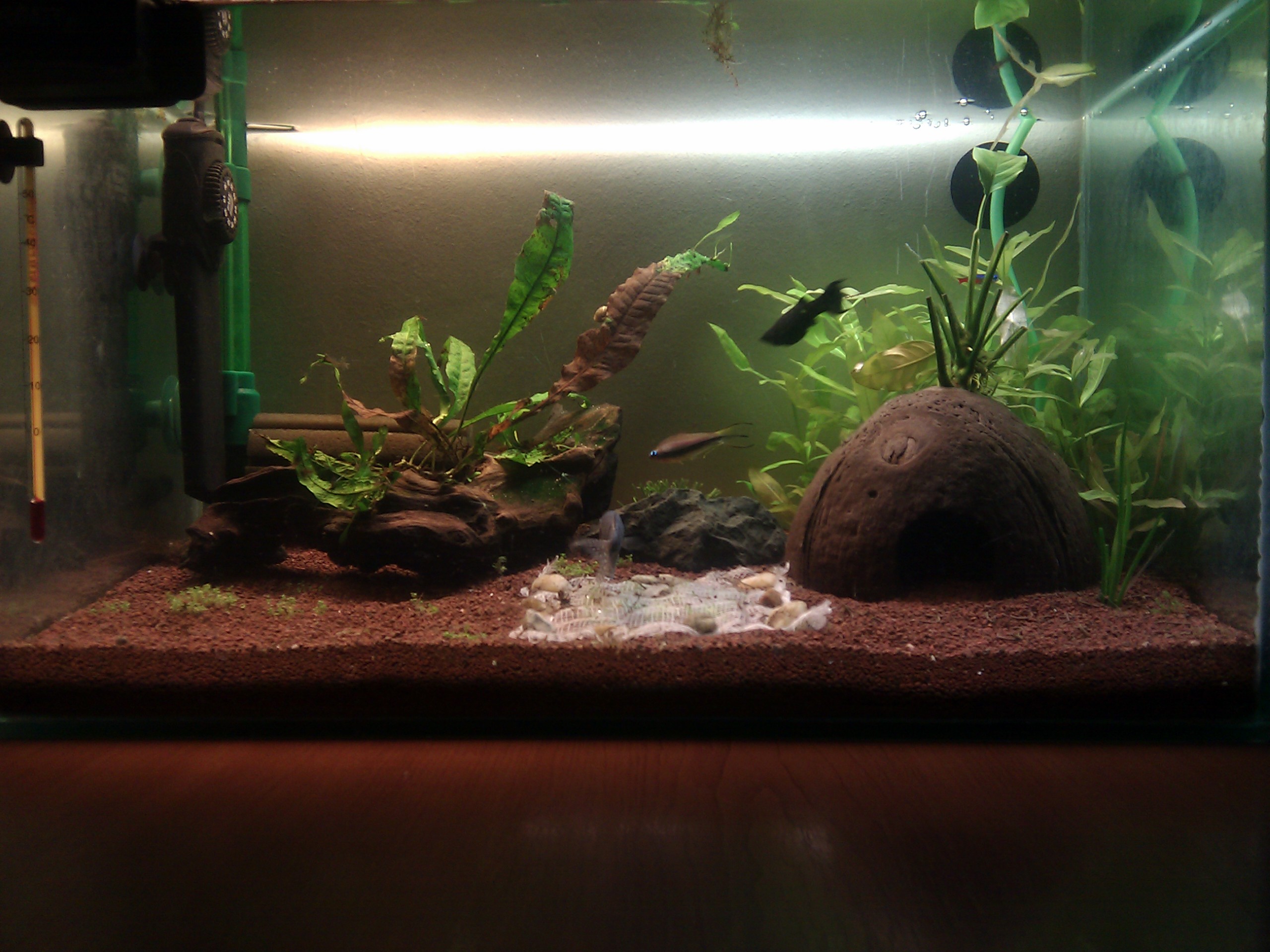 Initial in acest acvariu a fost plantata doar cuba acum aproximativ 4 luni intr`o incercare esuata de Iwagumi , dar pe atunci lumina era formata doar din cele 2 becuri . Plantele si pestii provin dintr`un acvariu "decedat" (incepuse sa aiba scurgeri) .
