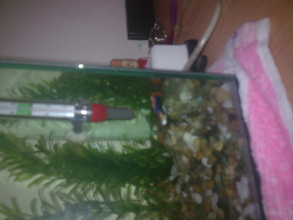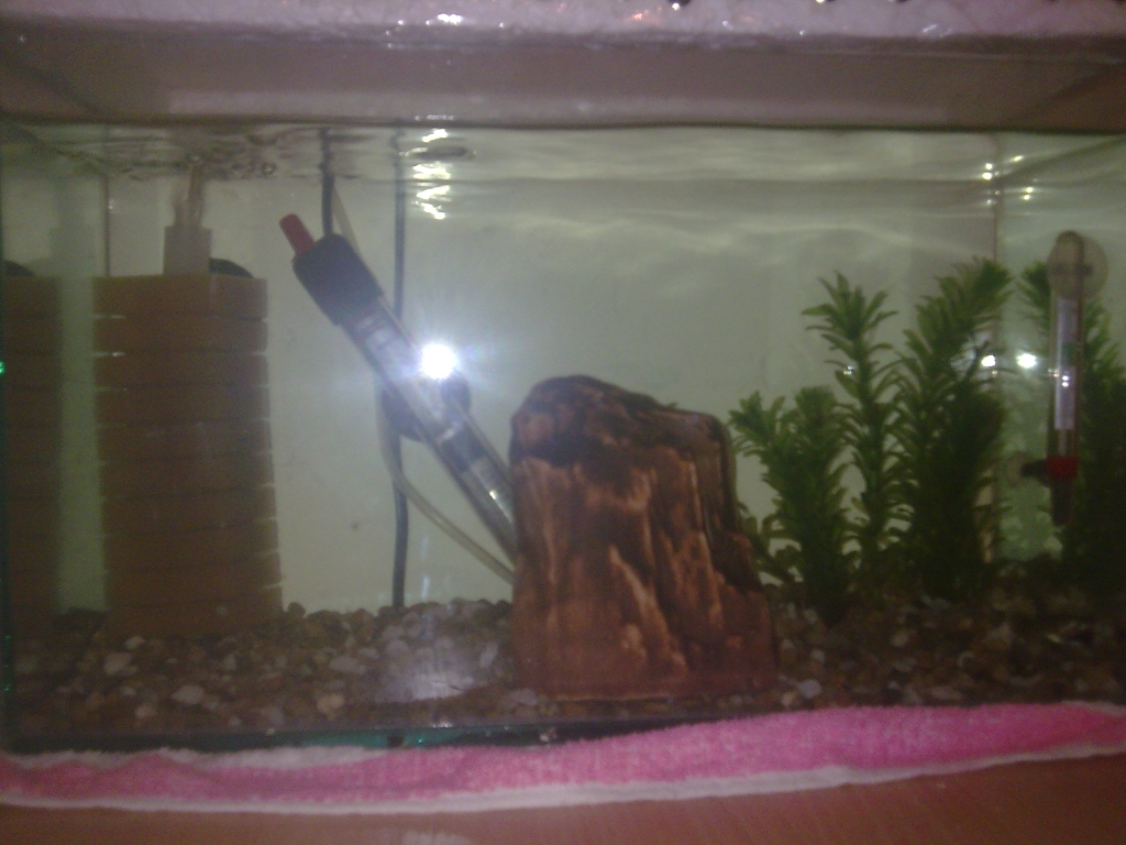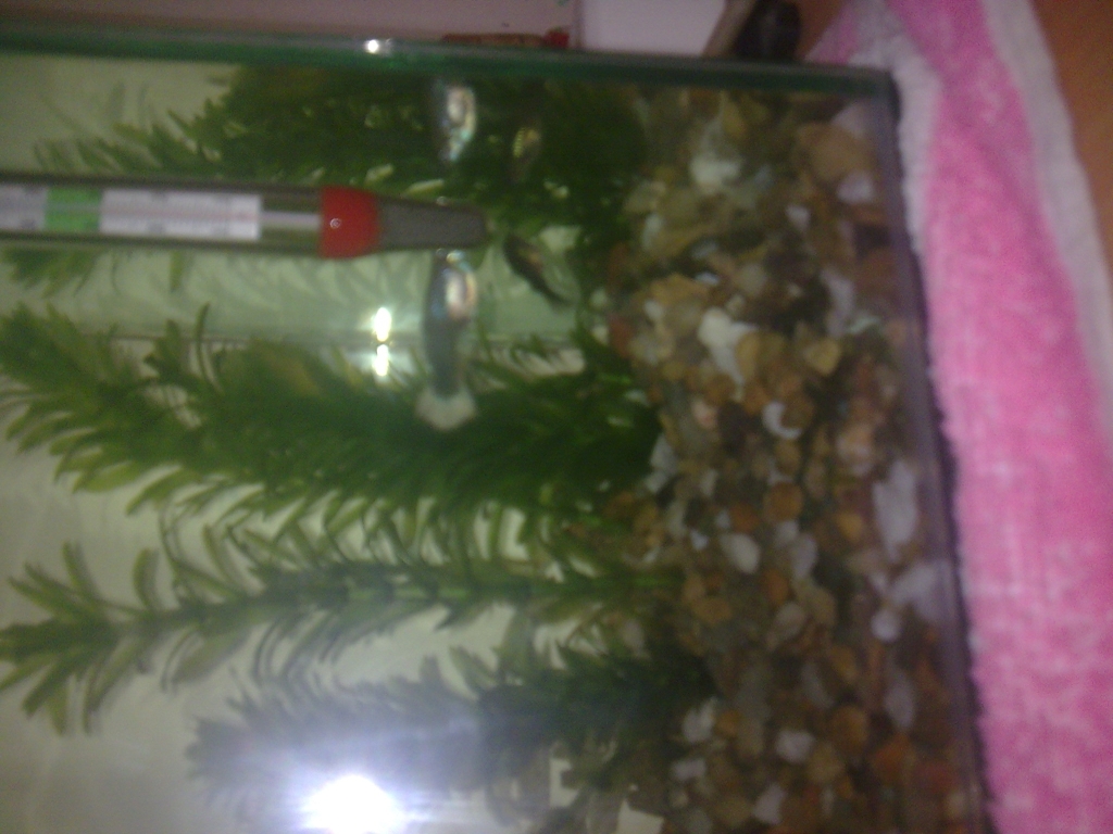 Temperatura este de 25 grade C, le dau de mancare de 3 ori pe zi (cam vreo 7 granule si vreo 4 fulgi, de marime medie spre mica) si imi este frica sa nu fie prea putin, pentru ca masculul mereu este pe fundul acvariului si cauta de mancare. Si (daca merge attach) puteti vedea planta (plantele) care au trebuit taiate in doua pentru ca imi depaseau inaltimea acvariului si stateau la suprafata cu varful. Mai am un fel de stanca cu 2 gauri si goala pe dinauntru, cu rol de ascunzatoare si da, inca imi mai trebuie pietris, dar nu a mai avut la magazin si atunci cand avea (presupun ca avea, pentru ca atunci cand ma duceam nu mai avea) nu aveam timp.