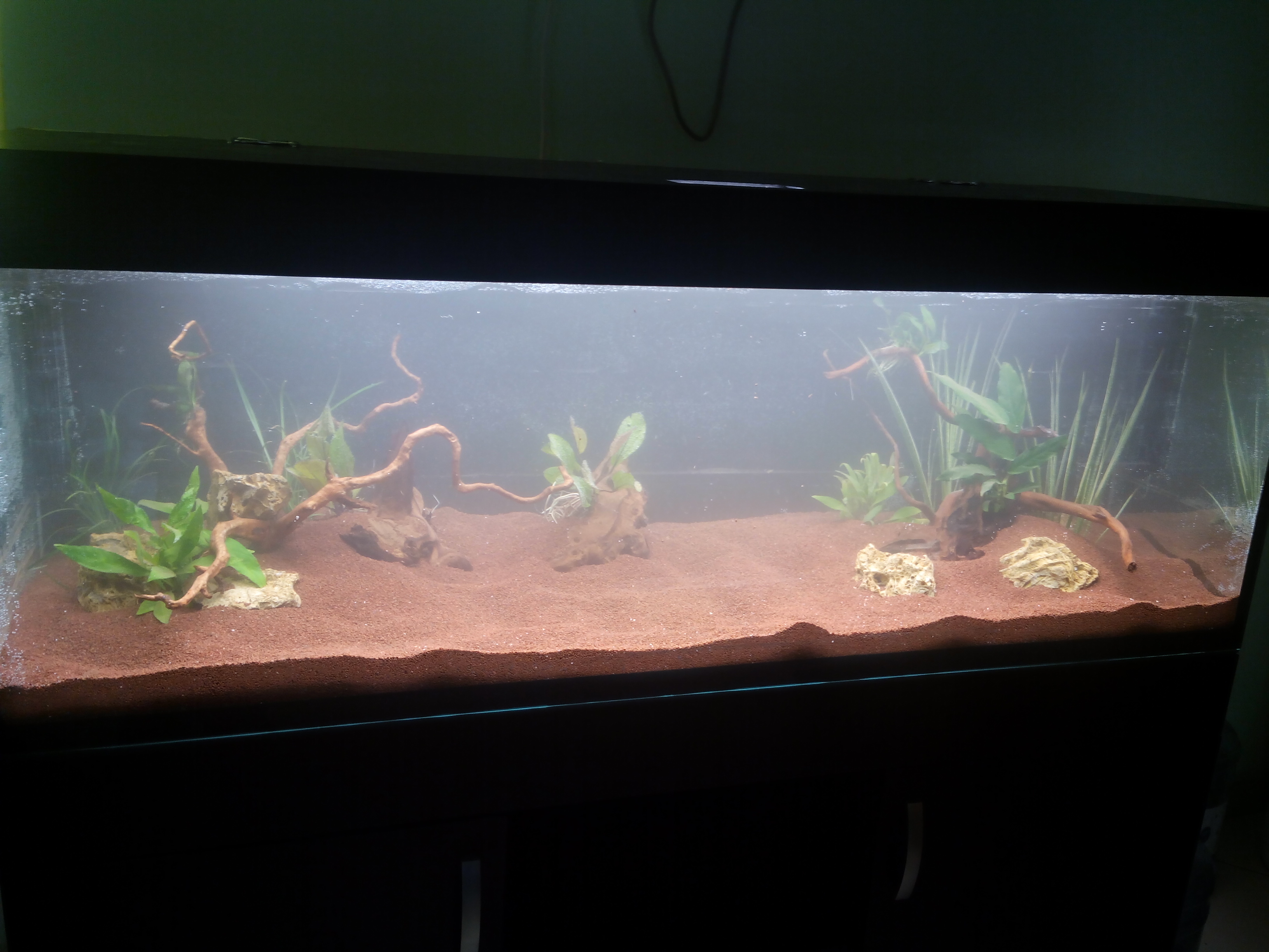 De zburat prin acvariu nu mai zboara din el ca l-am spalat si lasat in apa 7 zile. Plantele o sa incerc sa pun din acelea gen: Anubis etc.