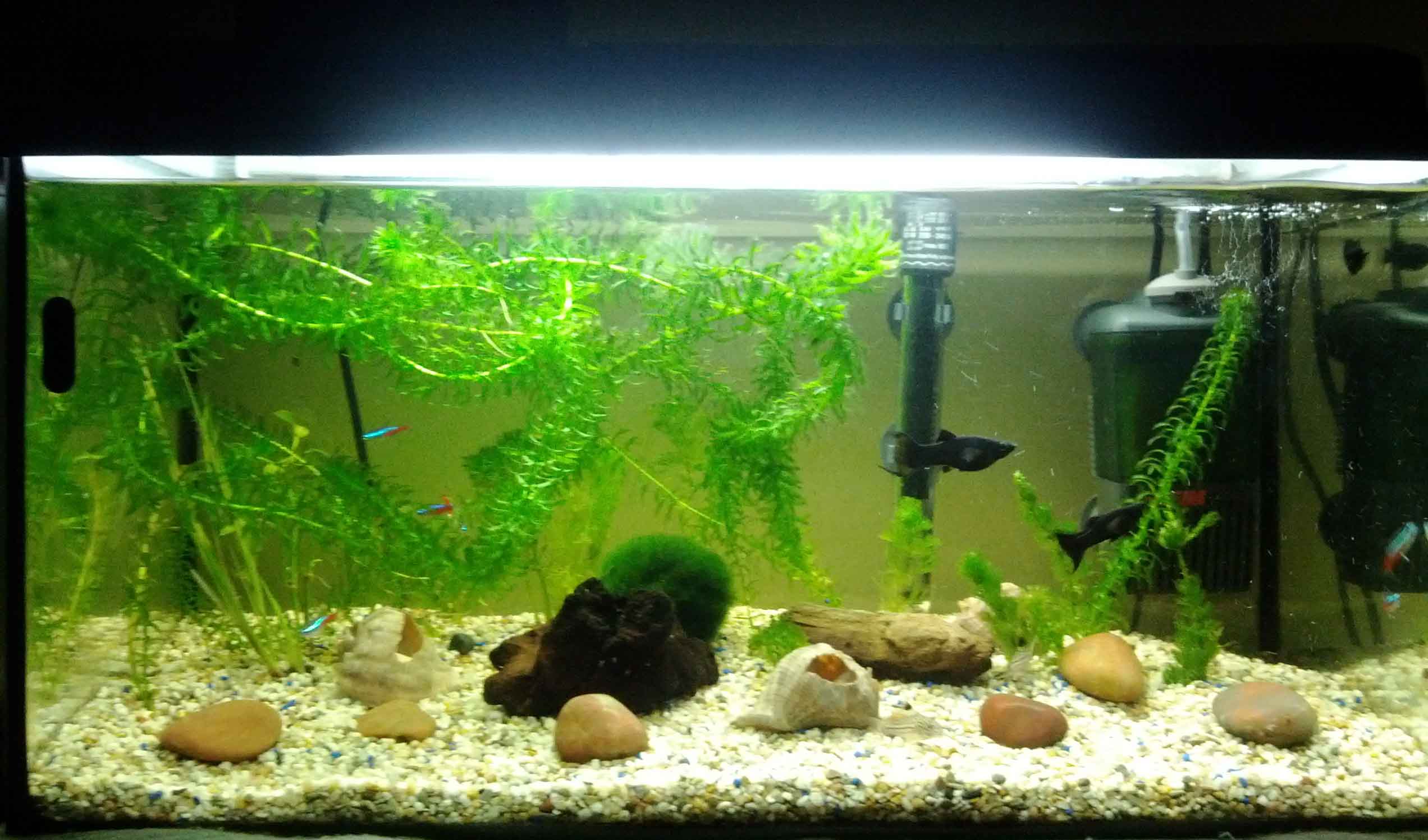 In momentul asta convietuiesc fericiti 10 neoni, 3 molly maturi (2 femele si un mascult), doi molly pui (probabil ca ar trebui tinuti separat dar nu mai am chef de investit in alt acvariu; plus ca au rezistat bine mersi de cateva saptamani) si doi sanitari (cory). Plus balariile aferente.