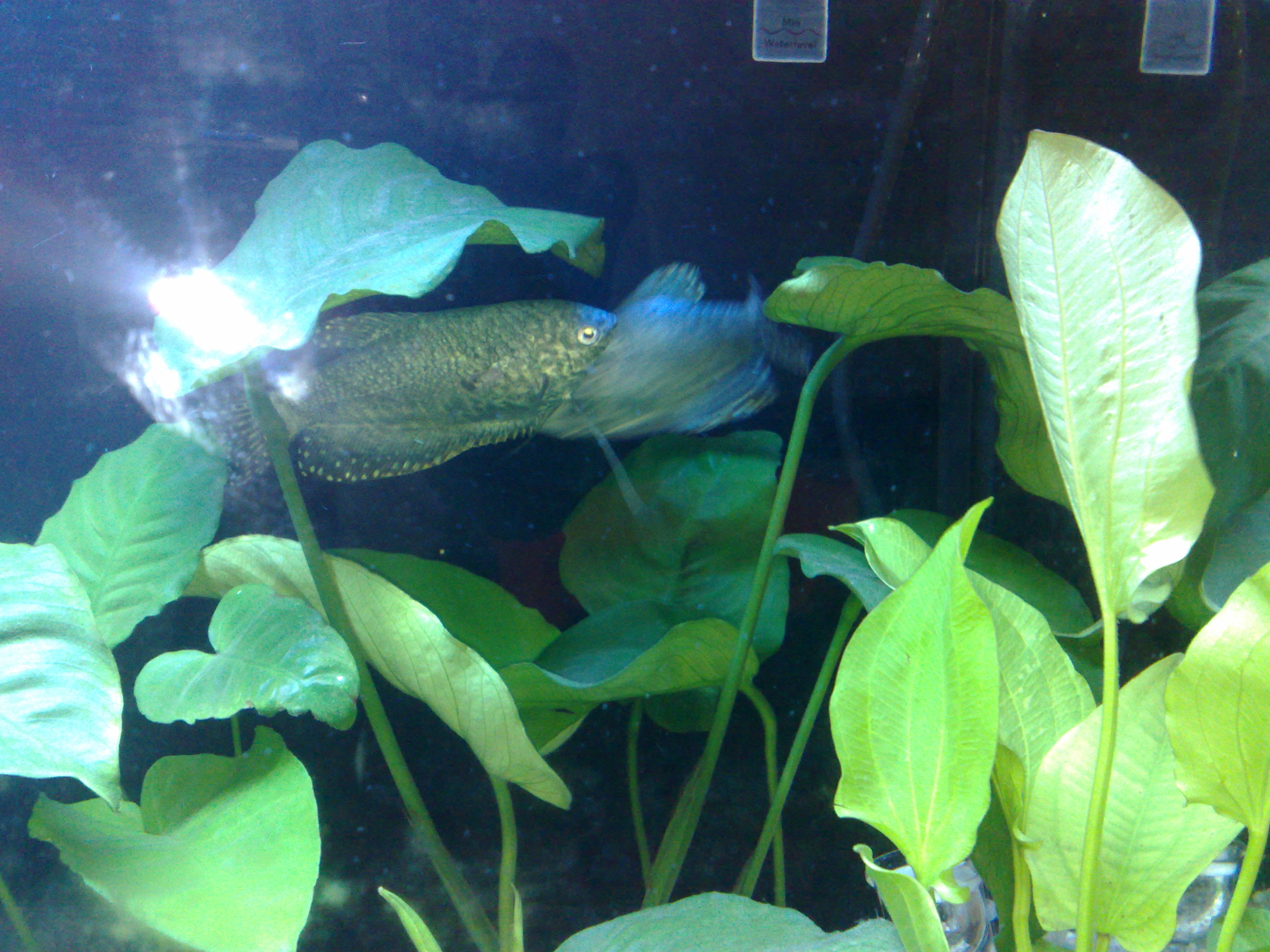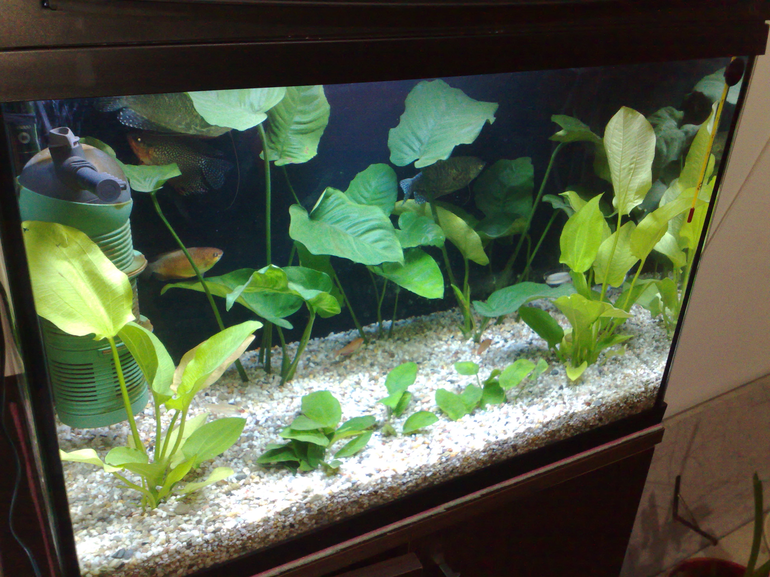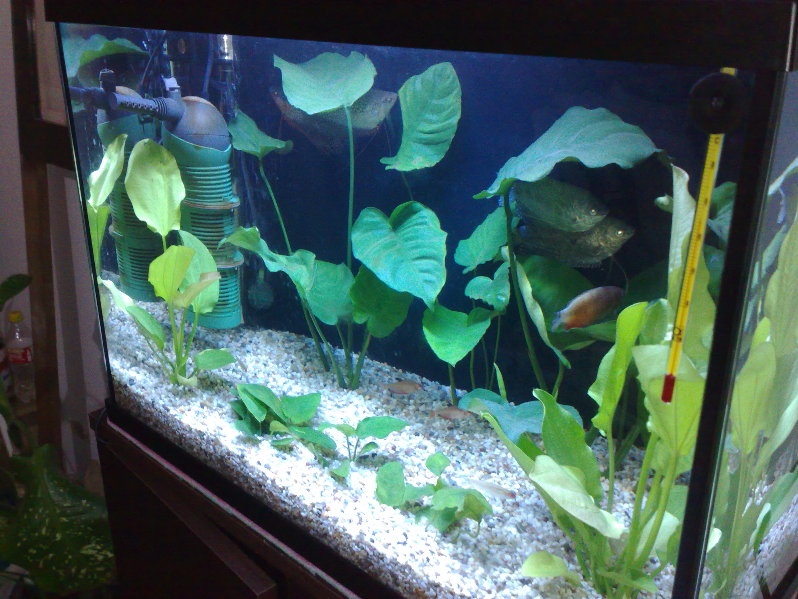 In cele ce urmeaza o sa va prezint acvariul meu...fotografiile nu sunt foarte reusite,sunt facute cu un tel mobil.Acvariul are 80l,daca mai adaog pietrisul cred ca raman vreo 73-74l.Am un filtru eheim,sper ca am scris bine,plantele inca nu stiu cum se numesc.Iluminatul este format din 2 neoane puse in capacul acvariului..PL24w.Pesti=2 gurami maturi,2 leri maturi,1 ancistrus,.si 2 mai mici nu stiu cum se numesc deocamdata,i-am primit de la un prieten.Incalzitor...150w.Temperatura este mentinuta la 27-28 grade.Deci proabil ca se vede destul de clar ca sunt incepator si voi avea nevoie de multe sfaturi.Am mai primit deja sfaturi de la cativa colegi-scorpionul-flash gordon-,stefanp,carora le multumesc pe aceasta cale....Acum cativa ani buni am mai avut un acvariu dar cu rezultate dezastruoase in special privind plantele...tocmai de aceea vreau sa pun la punct bine de tot acest subiect pentru inceput...va rog sa imi face-ti observatiile necesare.Pentru mine orce observatie este constructiva...