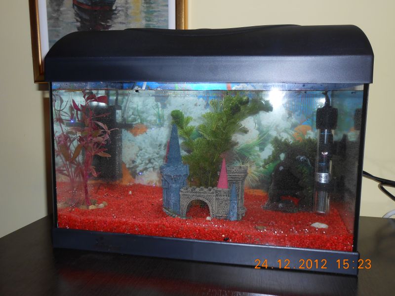 in primul rand acvariul este un startup 40 de 25L, cu un substrat de la Tetra Plant (complete substrat), vreo 3 kg de pietris rosu, 3 plante cumparate de la magazinul din piata (nu stiu ce fel de plante sunt; le-am luat la indicatia vanzatorului), bineainteles, un castel la indicatia pustoaicei mele, si in rest filtru si incalzitorul sunt cele venite in dotarea standard (nu stiu cat de ok sunt). am luat astazi si 6 buc pesti: 2- corydoras aeneus; 2- poecilia latipina si 2- Xiphophor maculat.