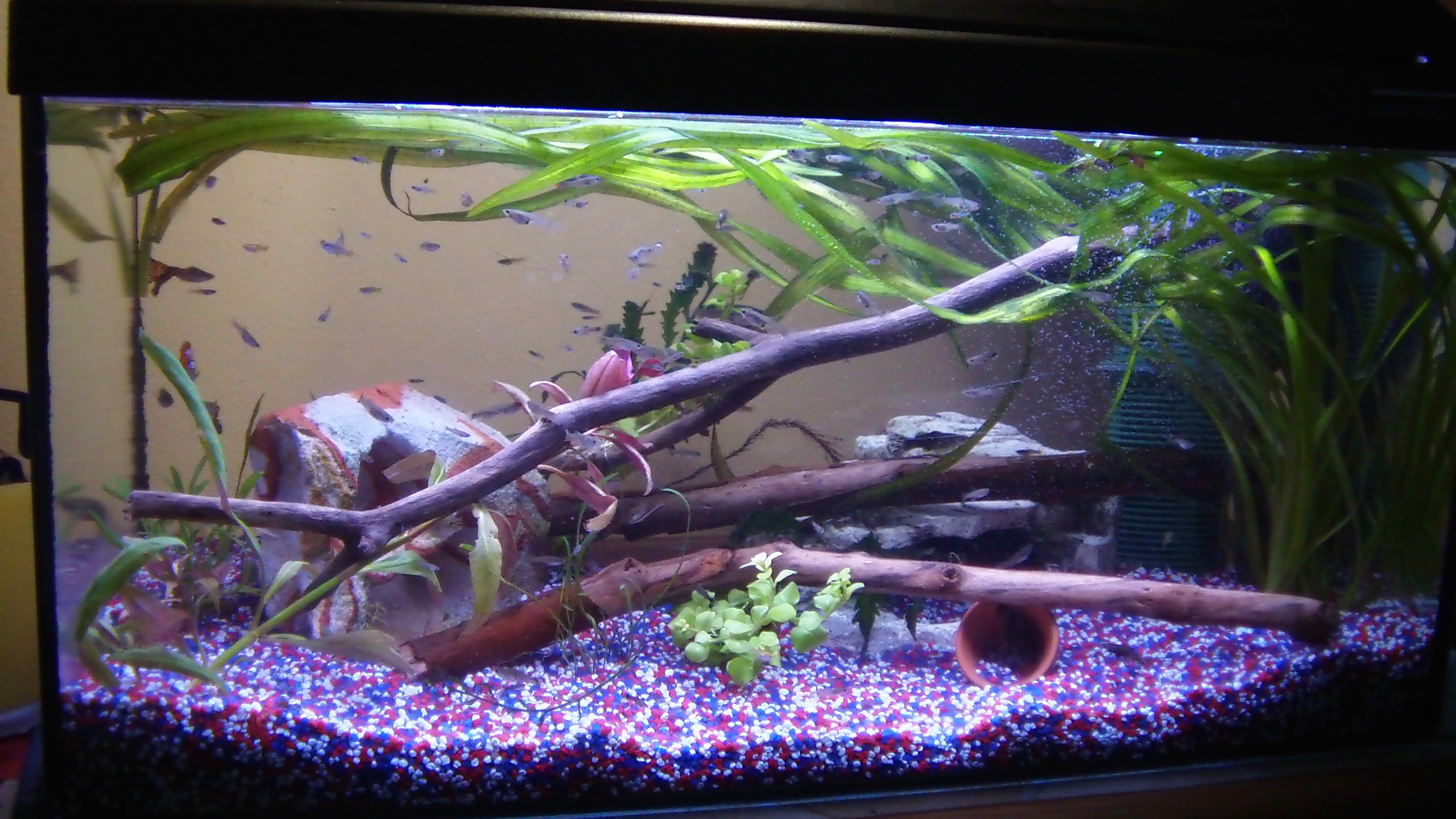 Sunt mama unui monstrulet de 6 ani, care si-a dorit animal de casa. Cum cainii si pisicile nu merg tinute la bloc, sobolanii nu ii suport, iar pasarile sunt prea galagioase, am facut rost de un acvariu second-hand. 54L, neon din fabricatie in capac, filtru eheim aquaball cu 3 camere. Nu pun nici un fel de ingrasamant, apa o scnimb la doua zile cate 2 galeti.