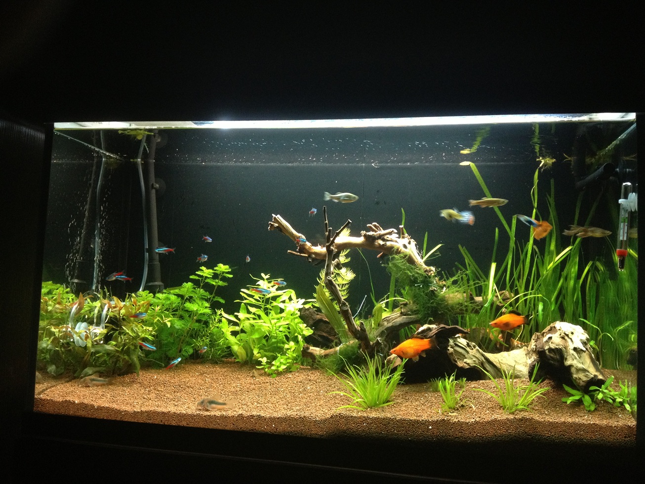 Salut. Vita aia era mai bine daca puteai sa o decojesti inainte de a o baga in acvariu, eventual sa o si fierbi. Acvariul arata bine, mie personal imi place. Insa ti-ar mai trebui lumina, fa o poza la capac poate te sfatuim cumva, sau daca nu un electrician iti va face ceva cu siguranta. Cumperi 2 socluri pentru t8 cu protectie la apa, pui tubul si apoi il prinzi cu soricei, asta ar fi o posibilitate.