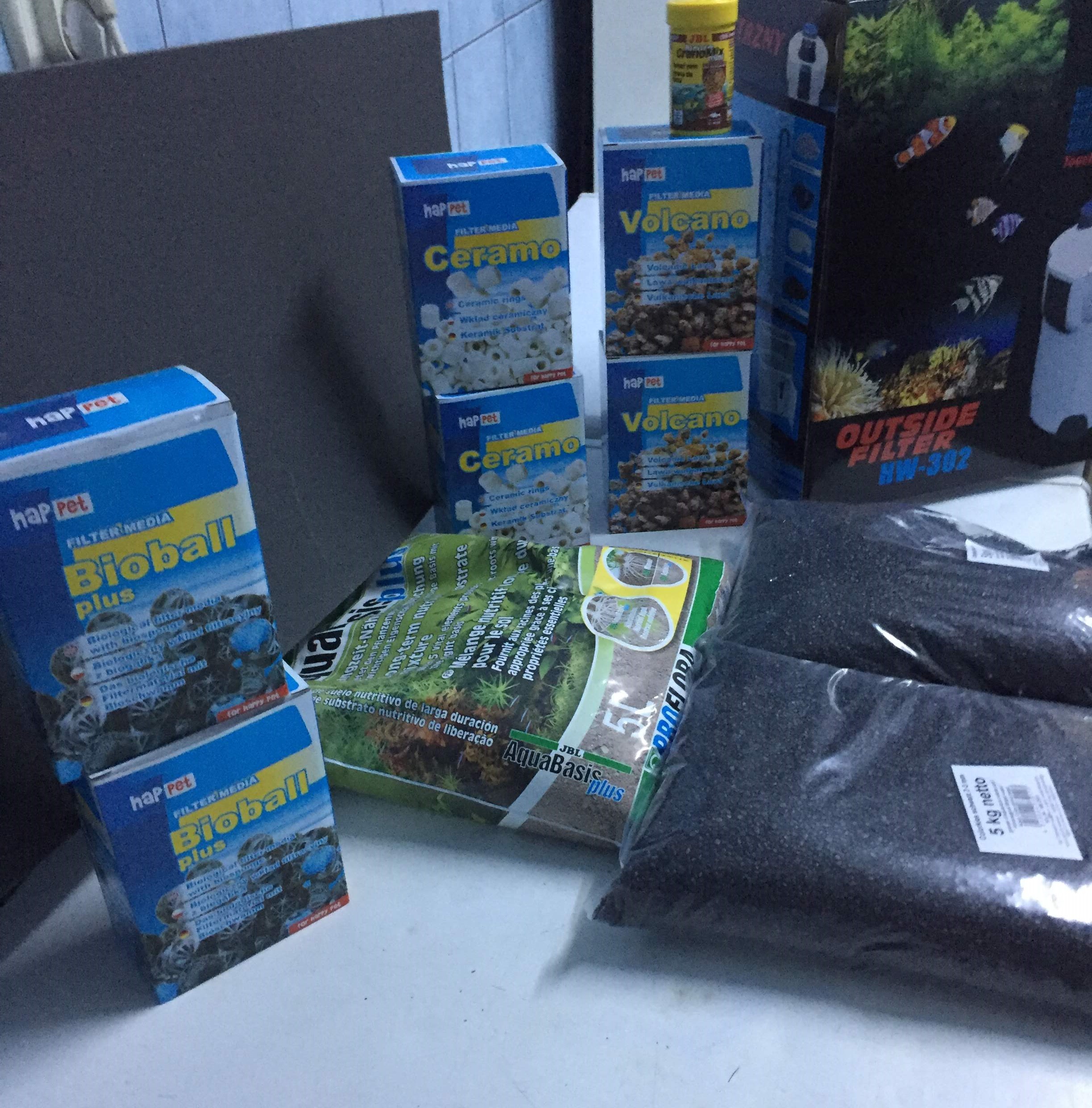 De la "piata" am luat cam asa: filtru extern sun sun HW302- am aflat dupa achizitie ca e si nu e sun sun  . Apoi, 10 kg pietris negru inert, 5 l proflora Plus, cate doua cutii de ceramice, vulcanic si bolls si sigur un pad nou pt acvariu vechi  Am mai luat o legatura  de cabomba, un buchet de anubias nana din micul acvariu ce il mai am acasa, un bolobot de moss ball de la ceeasi sursa.