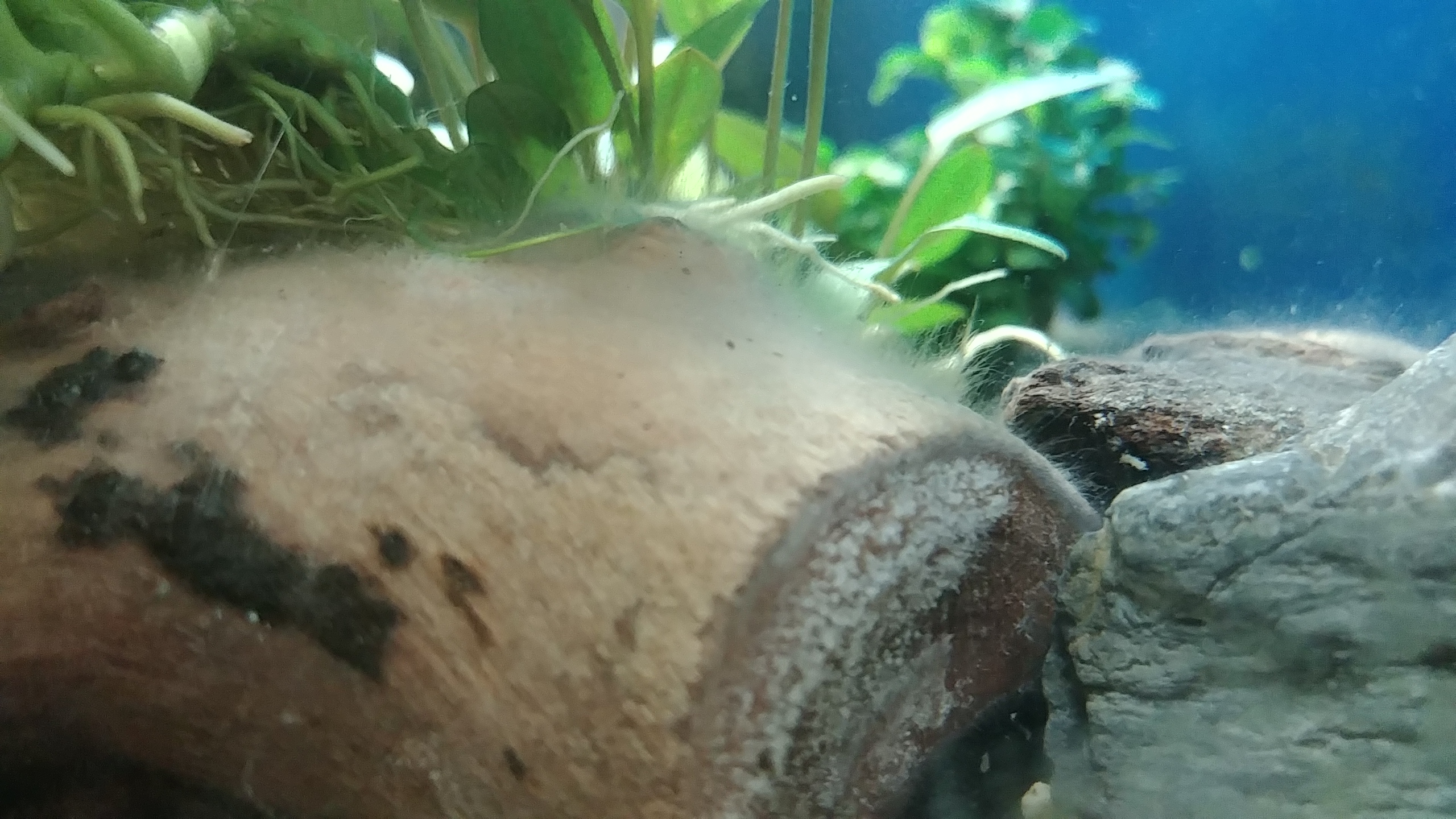 Salut, eu zic sa il lasi cum e. Am avut o problema asemanatoare cu o buturuga. Dupa ce a stat bine mersi peste o luna in acvariu, din a senin s-a umplut de puf, si parca crestea si mai mult dupa ce o spalam. Acum si-a revenit, dar au trecut cam 2 luni pana am scapat de el.