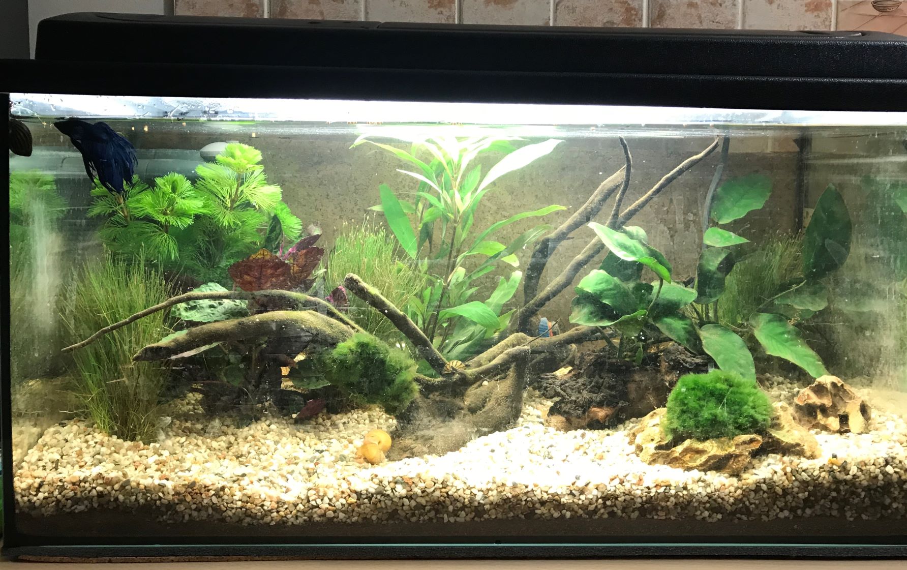 1 Betta, 2 anubias, 2 ghemotoace din alea de planta care seamana cu muschiul (cred Aegagropila linnaei) si niste din aia ca iarba ( cred Eleocharis acicularis).