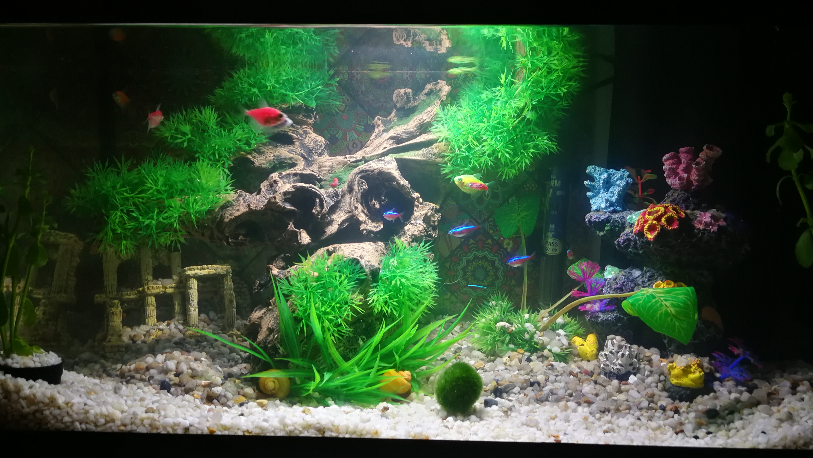 Filtru Ceramica carbon. Temperatura apei 28C substrat, piertis. Plante mix plastic si natural.