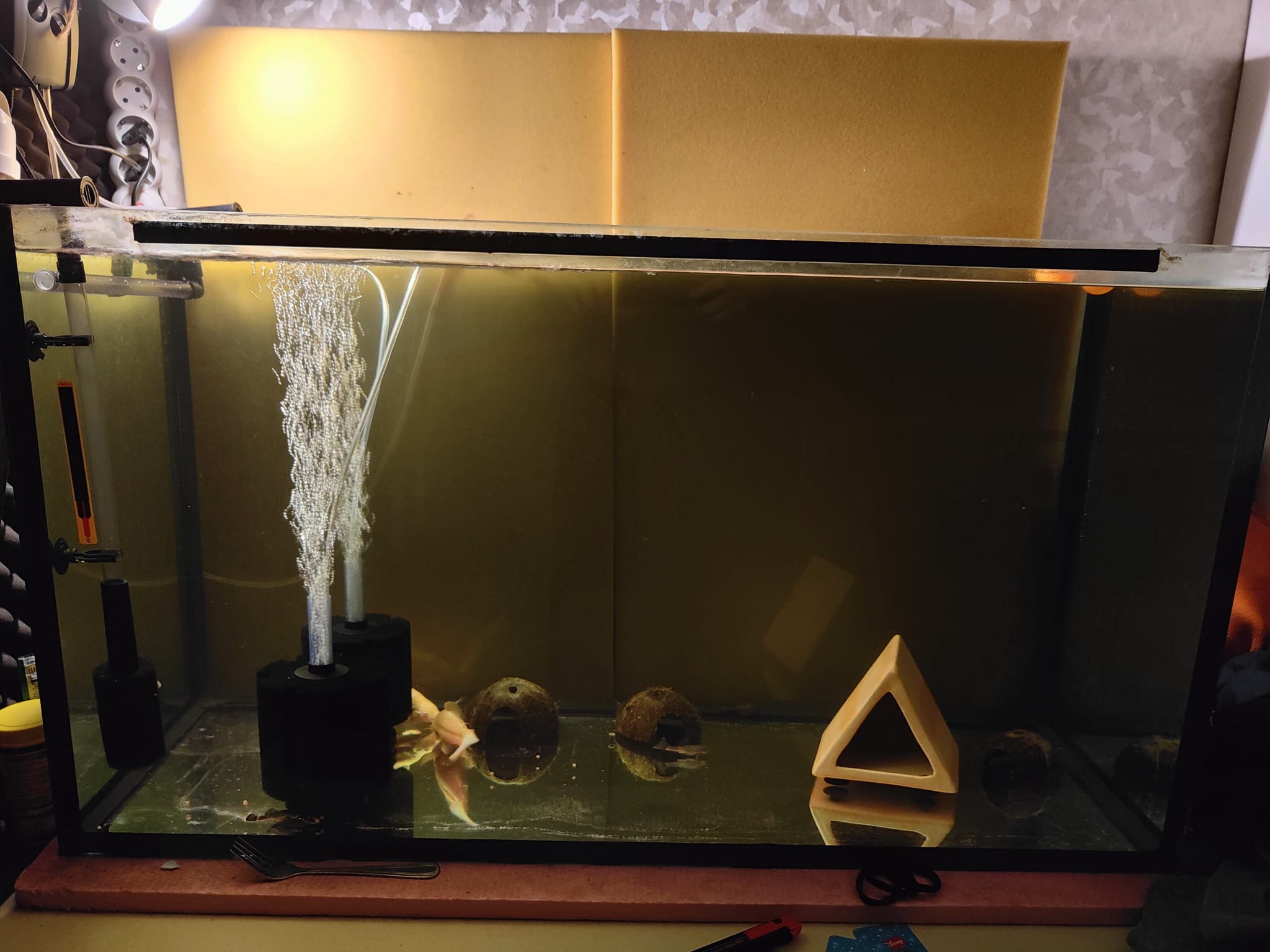 Acvariul nu este finalizat, lucrez la capac si neoane momentan. In acvariu sunt 2 hoplo pe care ii am de pui, cam 4-5 ani si mai sunt pe acolo 5 pui de ancistrus.