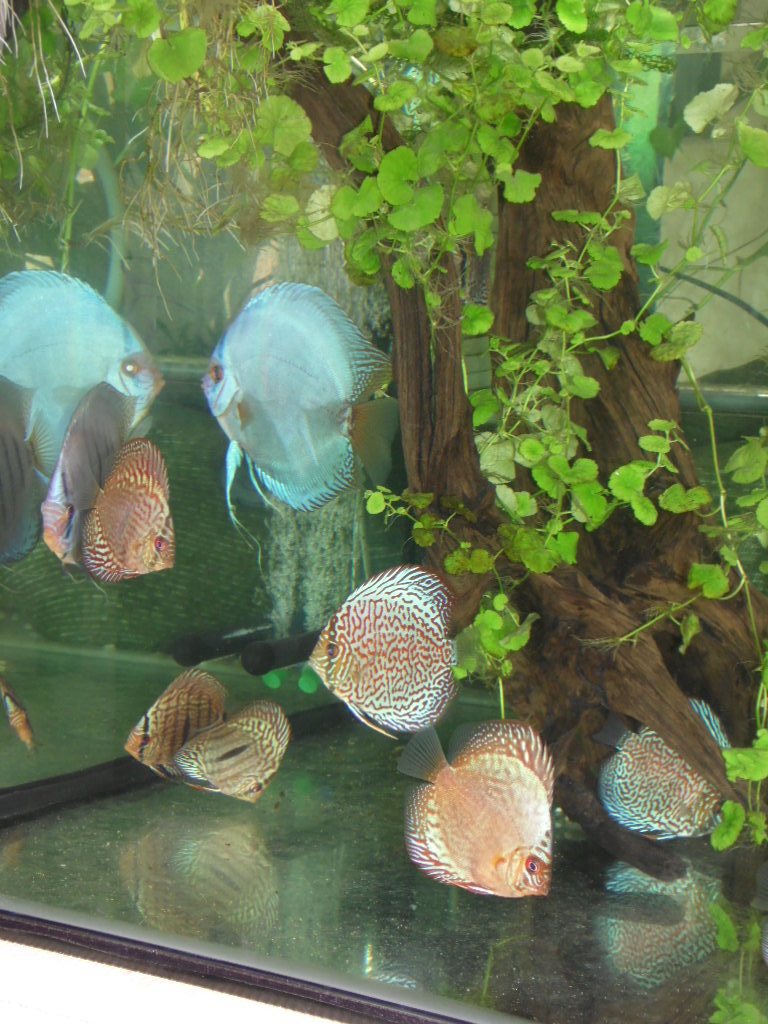 De 2 zile discusii erau apatici (15buc in total 10cm-12cm), culori inchise rau, aripioarele stranse , pititi in plante spre nemiscati, iar azi muuult mucus zbura din ei ....asa ca i-am bagat la carantina cu Furanol 250 - 1pastila/20L , sare 1L/10litri, temp 28grade.